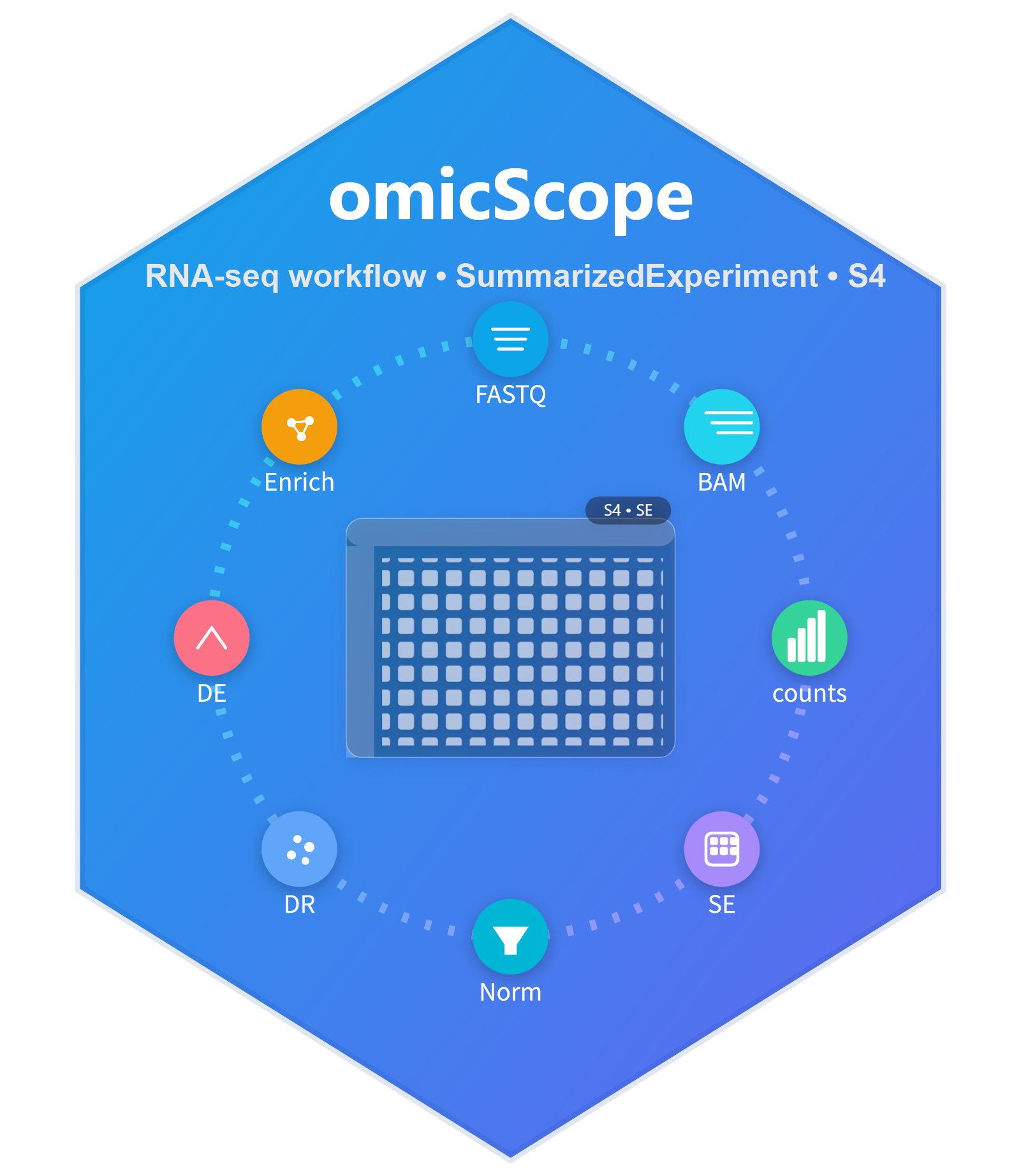 Built upon the robust SummarizedExperiment framework, omicScope addresses these limitations by encapsulating the complete RNA-seq analysis pipeline within a unified, object-oriented architecture. The package enables researchers to execute sophisticated analyses—including count normalization, PCA-based dimensionality reduction, differential expression testing, pathway enrichment analysis, and publication-quality visualization—through minimal, intuitive code. This design philosophy prioritizes both analytical rigor and practical usability, making advanced RNA-seq analysis accessible to researchers regardless of their computational background.