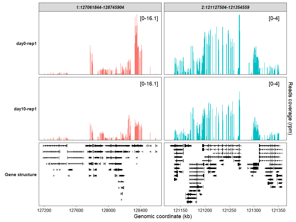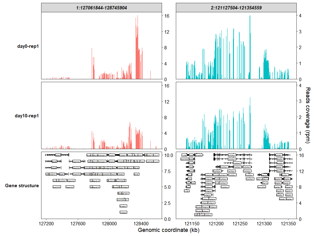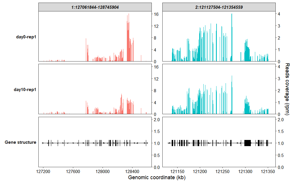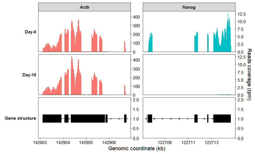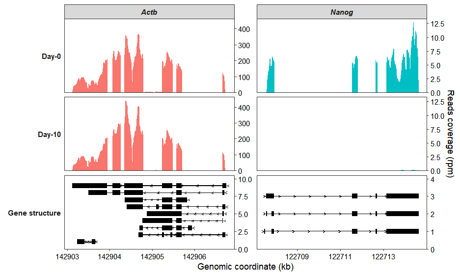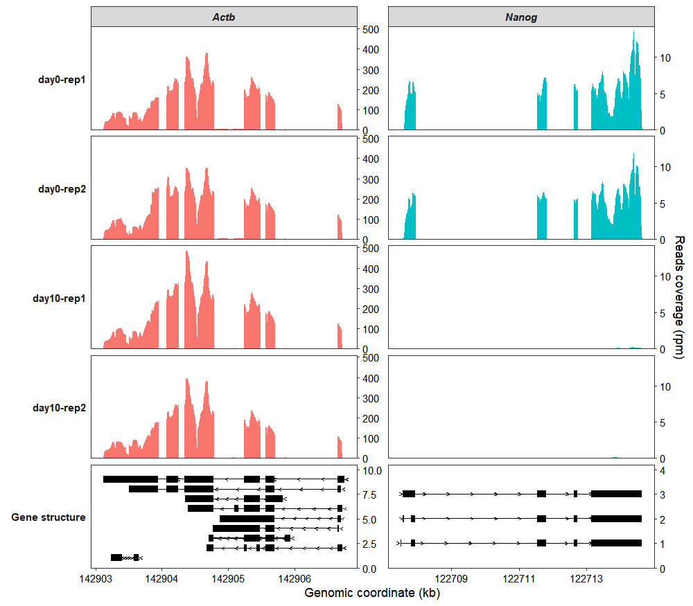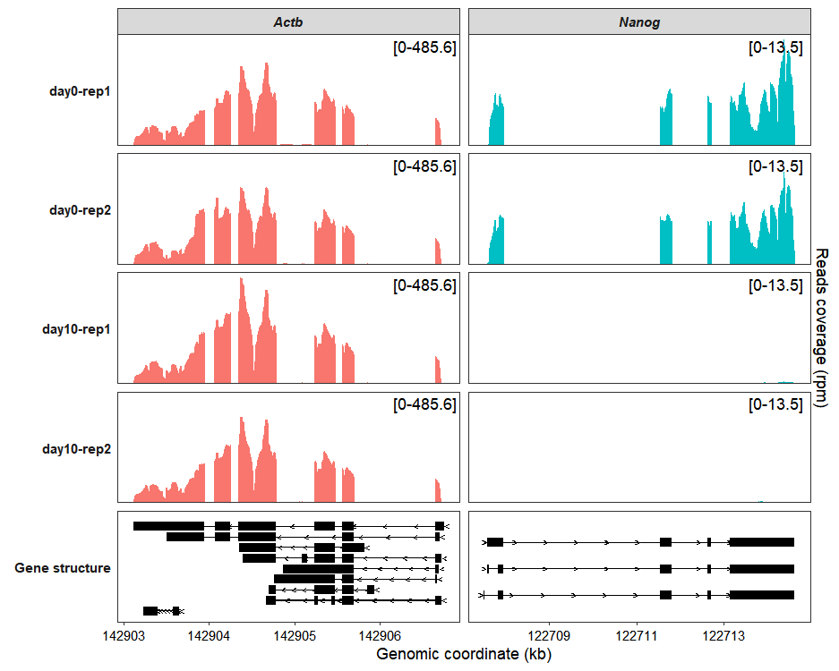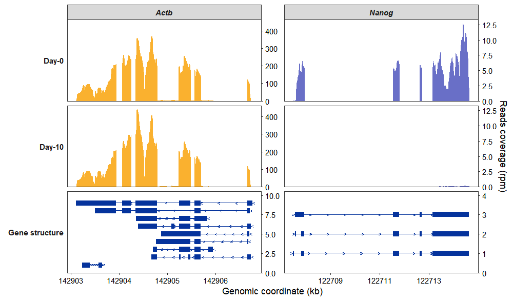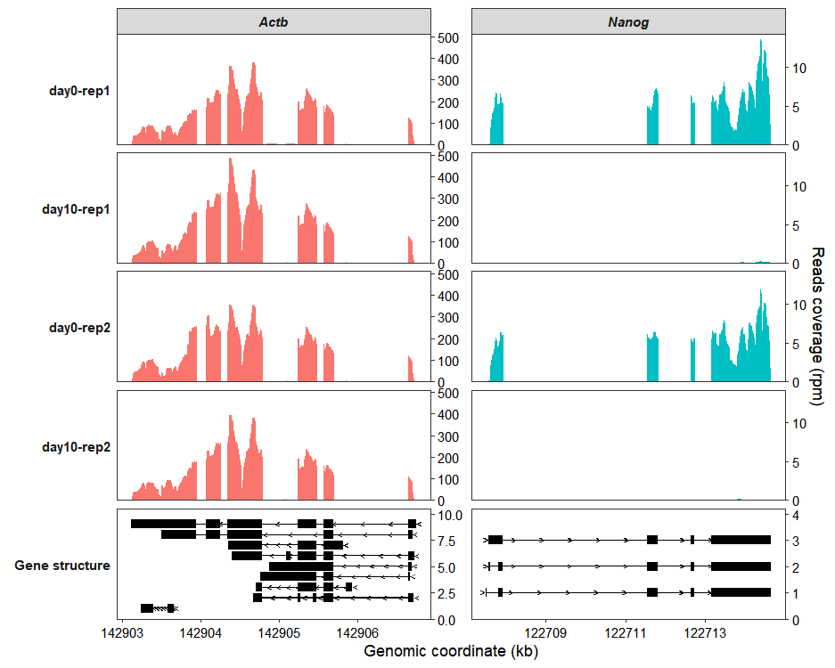 Using aligned BAM files and a GTF annotation file, we can specify genes for visualization via the target_gene parameter. Here, we’ll examine the expression changes of the pluripotency gene Nanog and the housekeeping gene Actb on Day 0 versus Day 10 of stem cell differentiation: