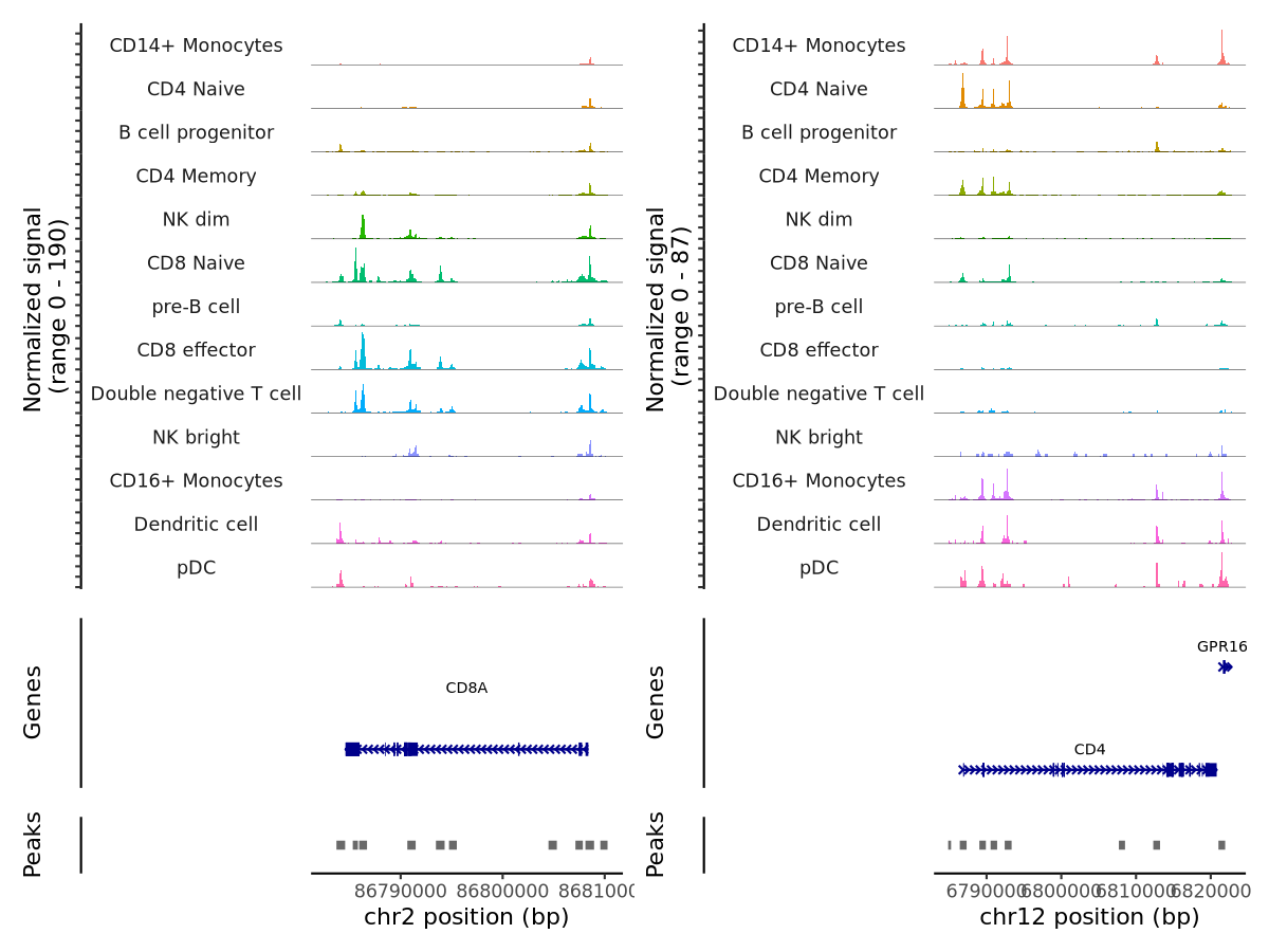 When analyzing single-cell epigenomic data such as scATAC-seq, packages like Signac have become a standard tool in the field. Building on its powerful foundation, we have developed an enhanced alternative to Signac’s CoveragePlot function. Our implementation, which generates plots like the coverage_plot shown previously, offers improved customizations and features.
