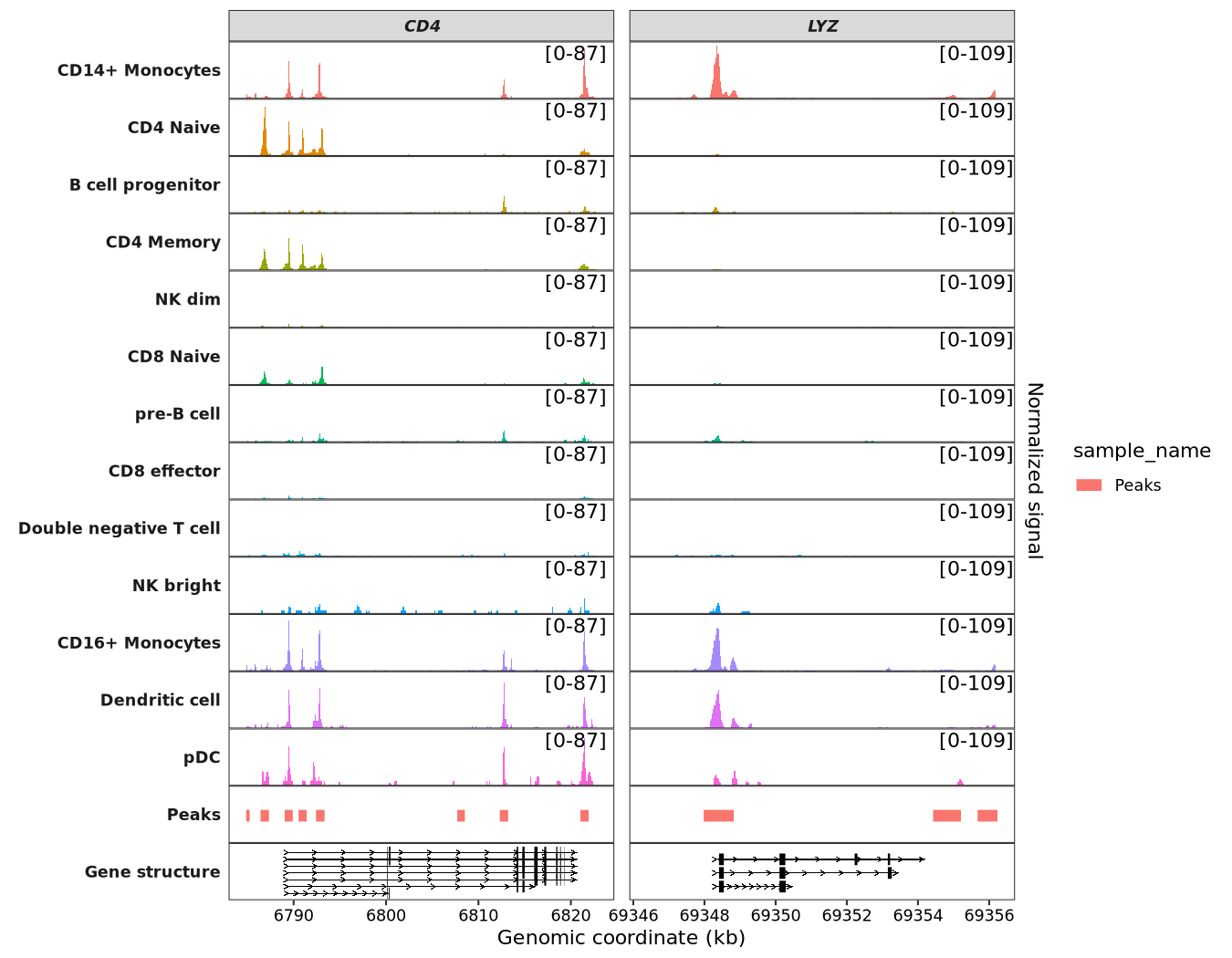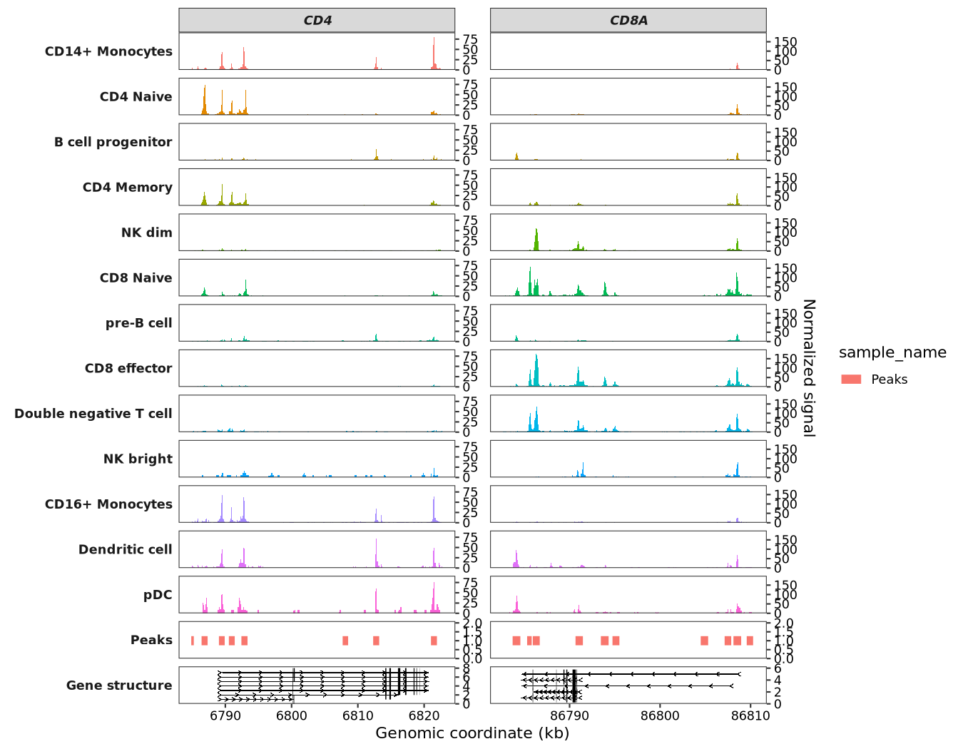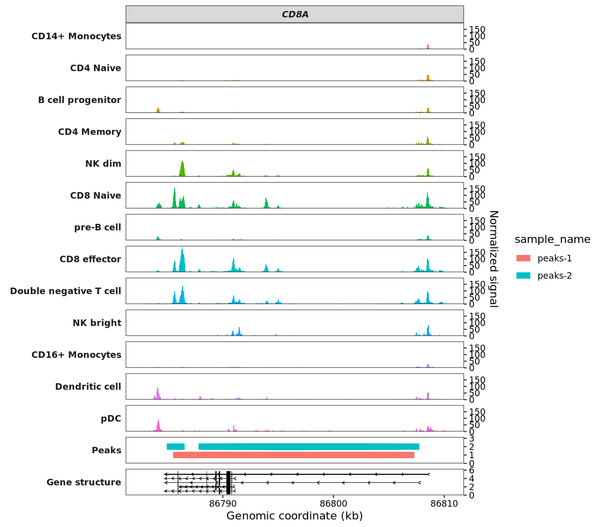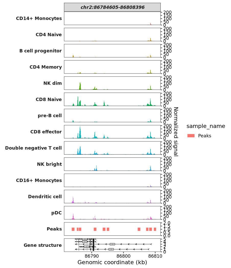 # 6 chr2 86793063 86802052 0.29 Peaks peaks-1 CD8ATo visualize the peaks, pass your data to the peaks_data argument: