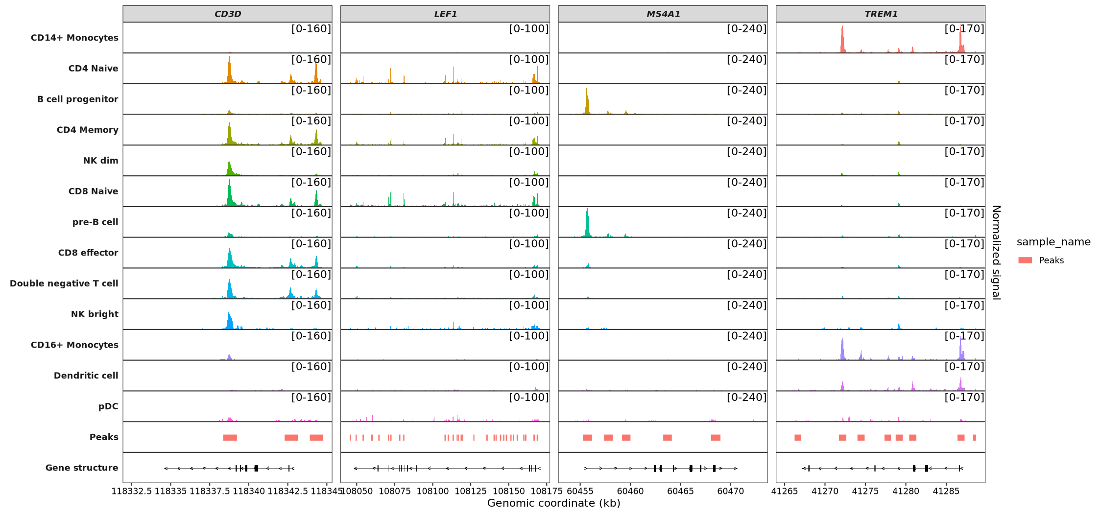 The coverage_plot function, by default, maintains a uniform y-axis scale for all samples faceted by the same gene or genomic region. This approach ensures direct comparability, but for datasets with widely varying signal intensities across different groups, it may be necessary to define custom y-axis ranges for individual samples. This allows for a more tailored visualization that better accommodates the specific characteristics of the data.