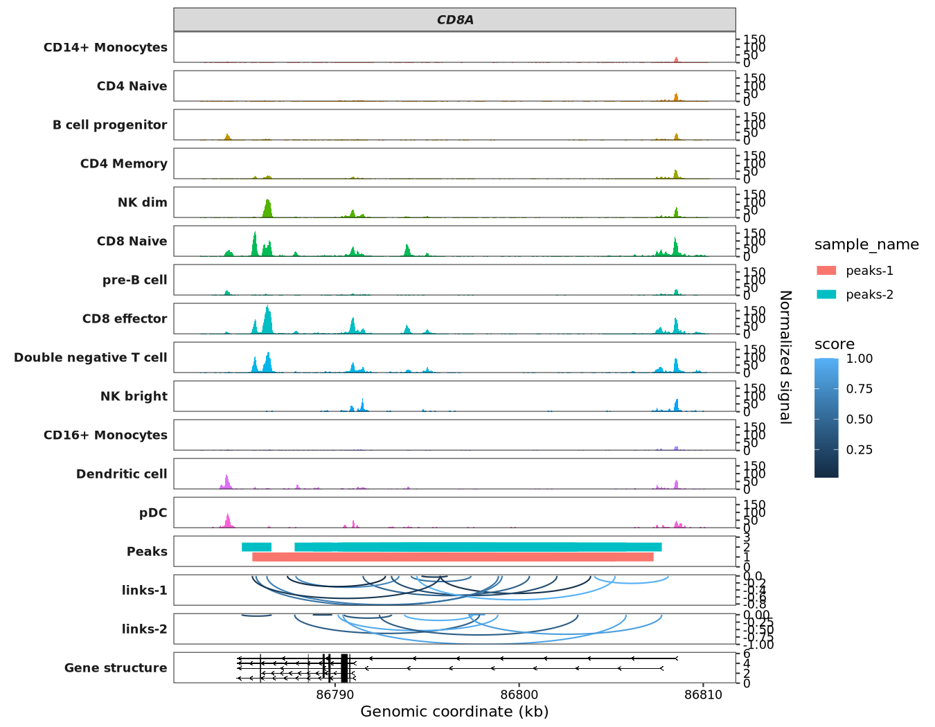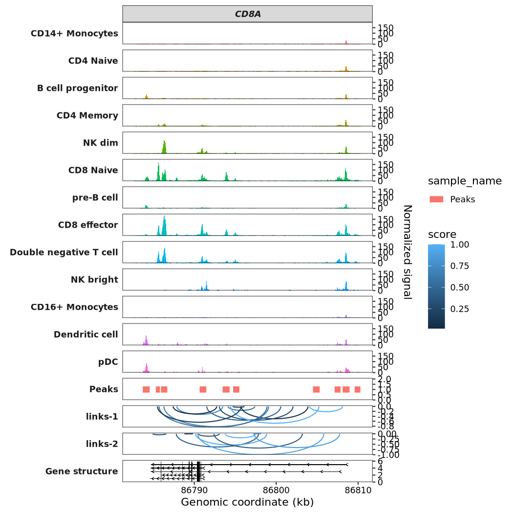 Link data is typically used for analyzing datasets such as Hi-C, co-accessibility, and enhancer-promoter interactions. For this example, we will randomly generate links between different sites within the CD8A gene for demonstration purposes. Please note that this data is purely illustrative and has no actual biological significance.