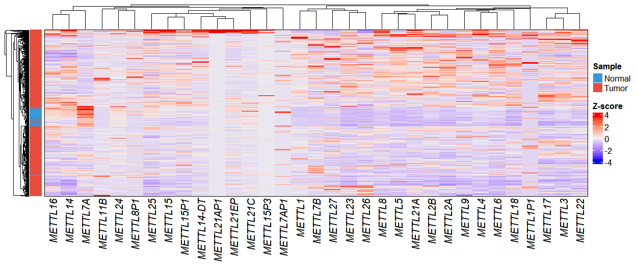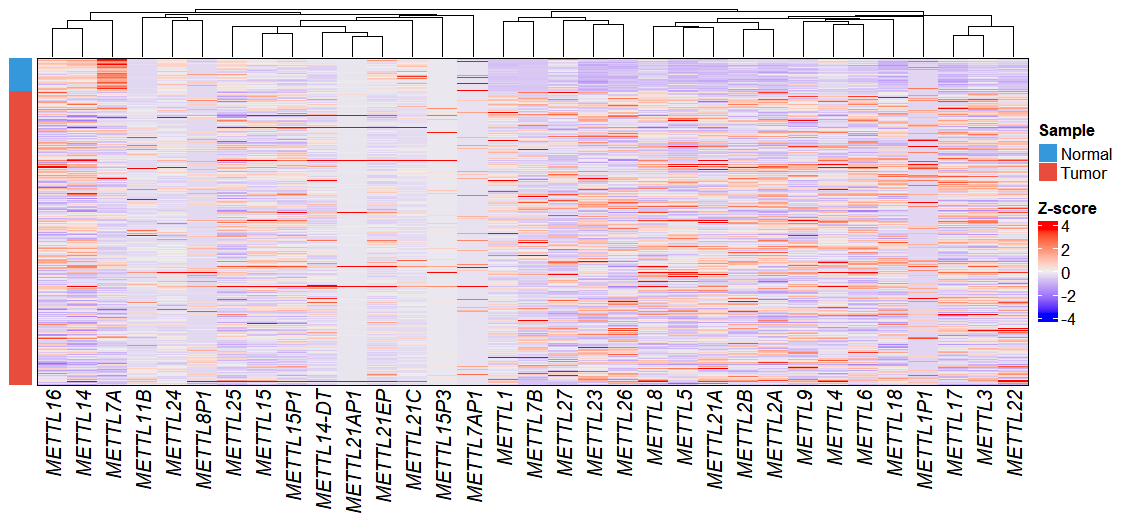 In this analysis, we filtered for genes in the METTL family and visualized their expression patterns using the exp_heatmap_plot function to create a heatmap: