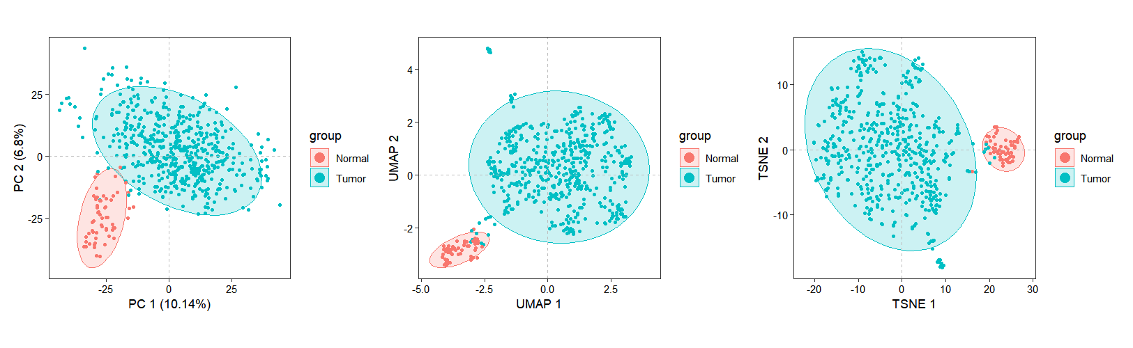 top_hvg_genes = 3000)The dimensionality reduction results are visualized using the dim_plot() function, which generates scatter plots of samples projected onto the reduced dimensional space: